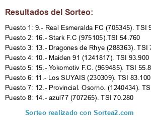 Lista de participantes: 10.- Leono FC (1234177). TSI 475.710, 11.- Sevilla.FC (706851). TSI 465.040, 12.- Deportivo Rahue S.A. (972147). TSI 449.280, 13.- Kupai Luqui FC (287855). TSI 408.300, 14.- losermen (285917). TSI 407.270, 15.- Los Anculigans F.C. (290410). TSI 391.890, 16.- Semillero del Hombre Nuevo (701624). TSI 357.890, 17.- Waychafe (1236486). TSI 342.700, 18.- Puerto Austral (974701). TSI 328.880.