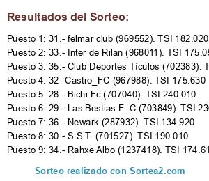 Lista de participantes: 28.- Bichi Fc (707040). TSI 240.010, 29.- Las Bestias F_C (703849). TSI 236.270, 30.- S.S.T. (701527). TSI 190.010, 31.- felmar club (969552). TSI 182.020, 32- Castro_FC (967988). TSI 175.630, 33.- Inter de Rilan (968011). TSI 175.050, 34.- Rahxe Albo (1237418). TSI 174.610, 35.- Club Deportes Tículos (702383). TSI 143.840, 36.- Newark (287932). TSI 134.920.
