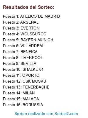Lista de participantes: BORUSSIA, ATELICO DE MADRID, OPORTO, MILAN, EVERTON, BENFICA, CSK MOSKU, FENERBAÇHE, ARSENAL, WOLSBURGO, LIVERPOOL, SEVILLA, MALAGA, BAYERN MUNICH, SHALKE 04, VILLARREAL..