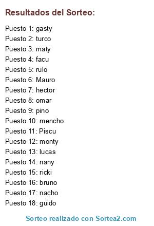 Lista de participantes: nany, turco, ricki, rulo, monty, pino, gasty, facu, nacho, mencho, omar, guido, bruno, hector, garri, lucas, maty, Mauro, Piscu.