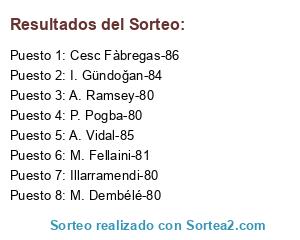Lista de participantes: A.Lora LD 72 AS ROMA, B.Ivanovic LD 81 AS ROMA, K.Grosskreutz LD 77 AS ROMA, M.Yanga-Mbiwa DFC 76 AS ROMA, N.Otamendi DFC 82 AS ROMA, B.Tremoulinas LI 77 AS ROMA, Eliseu LI 75 AS ROMA, William Carvalho MCD 78 AS ROMA, C.Kramer MCD 78 AS ROMA, Thiago A. MC 81 AS ROMA, F.Fabregas MC 84 AS ROMA, A.Ramsey MC 82 AS ROMA, R.Barkley MCO 78 AS ROMA, Z.Ibrahimovic DC 90 AS ROMA, C.Bacca DC 81 AS ROMA, F.Torres DC 80 AS ROMA, W.Bony DC 81 AS ROMA, M.Montoya LD 77 ATH. BILBAO, D.Yedlin LD 67 ATH. BILBAO, Thiago Silva DFC 87 ATH. BILBAO, N.Onuoha DFC 75 ATH. BILBAO, J.Okore DFC 73 ATH. BILBAO, D.Alaba LI 82 ATH. BILBAO, C.Tiote MCD 78 ATH. BILBAO, Carlos Peña MC 73 ATH. BILBAO, A.Iniesta MC 89 ATH. BILBAO, Y.Chikhaoui MCO 78 ATH. BILBAO, L.Podolski MI 77 ATH. BILBAO, Jese Rdgz. MI 76 ATH. BILBAO, F.Ribery MI 88 ATH. BILBAO, E.Lamela MD 78 ATH. BILBAO, G.Bale MD 87 ATH. BILBAO, M.Gomez DC 82 ATH. BILBAO, C.Benteke DC 80 ATH. BILBAO, S.Aurier LD 77 BAYER MUNICH, A.Barzagli DFC 83 BAYER MUNICH, R.Varane DFC 81 BAYER MUNICH, Marquinhos DFC 78 BAYER MUNICH, D.Criscito LI 78 BAYER MUNICH, J.Zuñiga LI 74 BAYER MUNICH, N.De Jong MCD 81 BAYER MUNICH, Sandro MCD 79 BAYER MUNICH, C.Kouyate MCD 71 BAYER MUNICH, Fernandinho MC 81 BAYER MUNICH, P.Aubameyang MD 79 BAYER MUNICH, K.Honda ED 79 BAYER MUNICH, Lucas Moura ED 82 BAYER MUNICH, M.Sow EI 78 BAYER MUNICH, L.Messi SD 93 BAYER MUNICH, D.Sturridge DC 83 BAYER MUNICH, V.Ibarbo DC 75 BAYER LEVERKUSEN, B.Sagna LD 80 BAYER LEVERKUSEN, Pepe DFC 83 BAYER LEVERKUSEN, Alex DFC 82 BAYER LEVERKUSEN, Dante DFC 82 BAYER LEVERKUSEN, L.Kurzawa LI 77 BAYER LEVERKUSEN, A.Cole LI 77 BAYER LEVERKUSEN, D.Blind MCD 79 BAYER LEVERKUSEN, S.Busquets MCD 85 BAYER LEVERKUSEN, Borja Valero MC 82 BAYER LEVERKUSEN, P.Coutinho MCO 81 BAYER LEVERKUSEN, G.Wijnaldum MCO 78 BAYER LEVERKUSEN, S.Feghouli MD 81 BAYER LEVERKUSEN, M.Reus MD 86 BAYER LEVERKUSEN, C.Atsu EI 76 BAYER LEVERKUSEN, R.Quaresma ED 80 BAYER LEVERKUSEN, M.Mandzukic DC 83 BAYER LEVERKUSEN, R.Lukaku DC 80 BAYER LEVERKUSEN, Joao Pereira LD 78 BORUSIA DORTMUND, Maxi Pereira LD 77 BORUSIA DORTMUND, L.Piszczek LD 82 BORUSIA DORTMUND, D.Godin DFC 84 BORUSIA DORTMUND, A.Laporte DFC 80 BORUSIA DORTMUND, F.Coloccini DFC 80 BORUSIA DORTMUND, P.Evra LI 80 BORUSIA DORTMUND, P.Lahm MCD 87 BORUSIA DORTMUND, Javi Garcia MCD 79 BORUSIA DORTMUND, A.Vidal MC 85 BORUSIA DORTMUND, K.Mirallas MD 80 BORUSIA DORTMUND, D.Payet MI 79 BORUSIA DORTMUND, Pedro Rgdz. EI 83 BORUSIA DORTMUND, J.Iturbe ED 77 BORUSIA DORTMUND, S.Doumbia DC 82 BORUSIA DORTMUND, S.Jovetic DC 81 BORUSIA DORTMUND, M.Klose DC 81 BORUSIA DORTMUND, D.Carvajal LD 79 CORDOBA, J.Mascherano DFC 83 CORDOBA, L.Castan DFC 81 CORDOBA, D.Carriço DFC 79 CORDOBA, K.Gibbs LI 78 CORDOBA, Antunes LI 76 CORDOBA, D.De Rossi MCD 84 CORDOBA, Fernando MCD 79 CORDOBA, J.Moutinho MCO 83 CORDOBA, D.Mertens MCO 82 CORDOBA, J.Cuadrado MD 83 CORDOBA, Koke R. MI 82 CORDOBA, I.Afellay MI 76 CORDOBA, M.Depay EI 78 CORDOBA, M.Susaeta ED 80 CORDOBA, Diego Costa DC 85 CORDOBA, S.Eto'o DC 81 CORDOBA, Coke LD 78 DEPORTIVO DE LA CORUÑA, A.Iraola LD 79 DEPORTIVO DE LA CORUÑA, V.Kompany DFC 86 DEPORTIVO DE LA CORUÑA, I.Martinez DFC 79 DEPORTIVO DE LA CORUÑA, J.Alba LI 81 DEPORTIVO DE LA CORUÑA, S.Bender MCD 81 DEPORTIVO DE LA CORUÑA, Yaya Toure MC 86 DEPORTIVO DE LA CORUÑA, Enzo Perez MC 81 DEPORTIVO DE LA CORUÑA, K.P.Boateng MCO 80 DEPORTIVO DE LA CORUÑA, James Rdgz. MCO 86 DEPORTIVO DE LA CORUÑA, I.Perisic MI 76 DEPORTIVO DE LA CORUÑA, K.Asamoah MI 79 DEPORTIVO DE LA CORUÑA, S.Sam MD 78 DEPORTIVO DE LA CORUÑA, P.Ebert MD 75 DEPORTIVO DE LA CORUÑA, K.Volland MD 79 DEPORTIVO DE LA CORUÑA, L.Narsingh ED 75 DEPORTIVO DE LA CORUÑA, L.Suarez DC 89 DEPORTIVO DE LA CORUÑA, I.Abate LD 76 BARCELONA, I.Opara DFC 67 BARCELONA, Yun Sun Young DFC 65 BARCELONA, Sokratis P. DFC 82 BARCELONA, Balenziaga LI 77 BARCELONA, P.Van Aanholt LTI 71 BARCELONA, Iturraspe MCD 80 BARCELONA, Gabi MC 82 BARCELONA, R.Firmimo MCO 81 BARCELONA, Jesus Navas MD 82 BARCELONA, S.Cazorla MI 84 BARCELONA, D.Silva MI 87 BARCELONA, I.Muniain EI 80 BARCELONA, Bruma EI 76 BARCELONA, Hulk ED 83 BARCELONA, S.Agüero DC 87 BARCELONA, E.Hurtado DC 65 BARCELONA, Maicon LD 80 GETAFE, N.Vidic DFC 83 GETAFE, N.Subotic DFC 81 GETAFE, M.Musacchio DFC 79 GETAFE, A.Kolarov LI 78 GETAFE, Silvio LI 76 GETAFE, Felipe Melo MCD 81 GETAFE, I.Camacho MCD 79 GETAFE, J.Wilshere MC 81 GETAFE, Hernanes MC 81 GETAFE, K.De Bryune MCO 82 GETAFE, J.Farfan MD 83 GETAFE, Lass B. MD 76 GETAFE, T.Müller MD 86 GETAFE, Ibai Gomez EI 78 GETAFE, R.Sterling ED 80 GETAFE, G.Rossi DC 82 GETAFE, S.Coleman LD 79 LEVANTE, Miranda DFC 83 LEVANTE, M.Skrtel DFC 81 LEVANTE, L.Perea DFC 74 LEVANTE, M.Schmelzer LI 76 LEVANTE, P.Armero LI 73 LEVANTE, Ramires MCD 81 LEVANTE, M.Fellaini MCD 79 LEVANTE, C.Marchisio MC 83 LEVANTE, M.Hamsik MCO 82 LEVANTE, A.Robben MD 90 LEVANTE, Bolly MD 64 LEVANTE, A.Schürrle MI 81 LEVANTE, Vitolo MI 77 LEVANTE, S.Varela EI 78 LEVANTE, Biabiany ED 79 LEVANTE, K.Benzema DC 85 LEVANTE, K.Walker LD 77 LIVERPOOL, Juanfran LD 79 LIVERPOOL, Abdennour DFC 79 LIVERPOOL, O.Toprak DFC 79 LIVERPOOL, L.Koscielny DFC 81 LIVERPOOL, Alex Sandro LI 78 LIVERPOOL, M.Schneiderlin MCD 80 LIVERPOOL, R.Nainggolan MC 81 LIVERPOOL, J.Callejon MCO 80 LIVERPOOL, S.Kagawa MCO 83 LIVERPOOL, M.Gotze MCO 86 LIVERPOOL, V.Stocker MI 79 LIVERPOOL, G.Deulofeu MD 76 LIVERPOOL, Willian MD 82 LIVERPOOL, Rodrigo M. DC 80 LIVERPOOL, Welbeck DC 78 LIVERPOOL, R.Van Persie DC 87 LIVERPOOL, J.Vertonghen DFC 82 MAN.CITY, E.Mangala DFC 80 MAN.CITY, M.Sakho DFC 80 MAN.CITY, C.Ansaldi LI 77 MAN.CITY, S.Radu LI 77 MAN.CITY, A.Song MCD 80 MAN.CITY, G.Barry MCD 80 MAN.CITY, J.McCarthy MCD 80 MAN.CITY, L.Modric MC 87 MAN.CITY, Oscar MCO 84 MAN.CITY, S.Lichtsteiner MD 77 MAN.CITY, Aleix Vidal MD 76 MAN.CITY, A.Ljajic EI 77 MAN.CITY, A.Candreva ED 83 MAN.CITY, G.Higuain DC 84 MAN.CITY, C.Tevez DC 85 MAN.CITY, M.Balotelli DC 81 MAN.CITY, Dani Alves LD 83 MAN.UNITED, Choi Chul Soon L