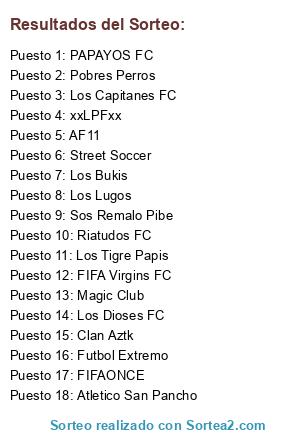 Lista de participantes: Los Capitanes FC, PAPAYOS FC, Atletico San Pancho, Pobres Perros, Clan Aztk, Los Bukis, Magic Club, Sos Remalo Pibe, Futbol Extremo, Street Soccer, Los Tigre Papis, Los Dioses FC, Los Lugos, Riatudos FC, FIFAONCE, xxLPFxx, AF11, FIFA Virgins FC.