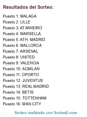 Lista de participantes: ARSENAL, JUVENTUS, MAN.CITY, UNITED, MALLORCA, MALAGA, VALENCIA, OPORTO, MARSELLA, ACMILAN, BETIS, ATH. MADRID, TOTTENHAM, AT.MINEIRO, REAL MADRID, LILLE.