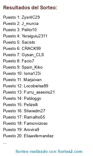 Lista de participantes: Juangutierrez91, Isma123i, CRACK99, Sacisto, Yeraiguiu2311, Pabloggv, IvaanM95, Facio7, Ramalho55, J_murcia, Stiwiedm27, Eliaasfernandez, Gysan_CLS, Pelito10, R9ronie, Furru_asesino21, Arovira9, Pedrovelasco95, Locobielsa89, Betito22, Pelizelli, Egimendia99, Tanito226, AdriC10, BorjaRT13, Regueiro_7, Spain_Kiko, Marjaivan, Famorvizoso, Jemi666, Zysr4C29, Ankibusa.