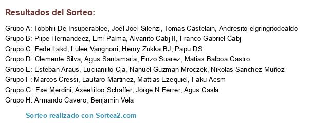 Lista de participantes: Tomas Castelain, Agus Santamaria, Lulee Vangnoni, Agus Casla, Marcos Cressi, Axeeliitoo Schaffer, Papu DS, Clemente Silva, Henry Zukka BJ, Jorge N Ferrer, Lautaro Martinez, Nikolas Sanchez Muñoz, Fede Lakd, Benjamin Vela, Alvariito Cabj II, Franco Gabriel Cabj, Enzo Suarez, Emi Palma, Faku Acsm, Luciianiito Cja, Mattias Ezequiel, Piipe Hernandeez, Andresito elgringitodealdo, Exe Merdini, Esteban Araus, Joel Joel Silenzi, Matias Balboa Castro, Tobbhii De Insuperablee, Armando Cavero, Nahuel Guzman Mroczek.
