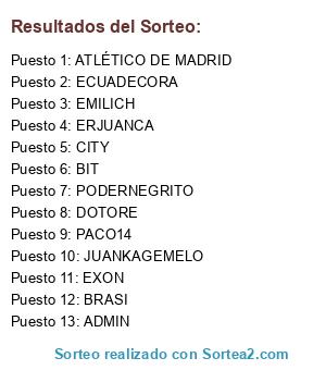 Lista de participantes: JUANKAGEMELO, EXON, PACO14, ATLÉTICO DE MADRID, BIT, ERJUANCA, EMILICH, CITY, PODERNEGRITO, ADMIN, DOTORE, ECUADECORA, BRASI.
