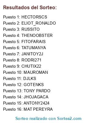 Lista de participantes: RUSSITO, MAUROMAN, HECTORSCS, ELIOT_RONALDO, MAT PEREYRA, ANTONY2424, JHOJAGACA, TATUMANYA, RODRI271, TONY PARDO, THENOOBSTER, CHUTIX22, GOTENKS, JANITOY2J, DJLKS, FITOFARAIS.