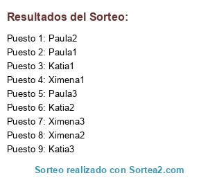Lista de participantes: Paula1, Ximena1, Katia1, Ximena2, Katia2, Paula2, Katia3, Paula3, Ximena3.