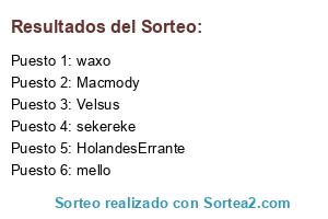 Lista de participantes: trevize, Mc_Cain, sekereke, Guille, Revenarius, Padrino Bufalo, antonio 6, Kike, runrul, CheKa, Comodoro, waxo, Eastwood, arthas_fito, Toninor, mello, Miltor, JJ Marwan, Velsus, Macmody, Jose1200C, citizeng, XOLLADOR, divil, PACO GALAN, nathangarciamuro, el casco, ignus42, HolandesErrante, ErreHache, matiascuadrado.