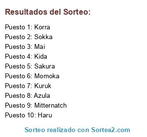 Lista de participantes: Haru, Kuruk, Korra, Sakura, Mitternatch, Mai, Sokka, Azula, Momoka, Kida.