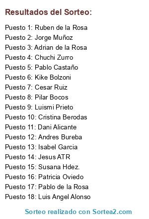 Lista de participantes: Andres Bureba, Pilar Bocos, Cesar Ruiz, Jesus ATR, Luismi Prieto, Susana Hdez., Ruben de la Rosa, Adrian de la Rosa, Pablo de la Rosa, Pablo Castaño, Jorge Muñoz, Patricia Oviedo, Cristina Berodas, Luis Angel Alonso, Chuchi Zurro, Kike Bolzoni, Dani Alicante, Isabel Garcia.