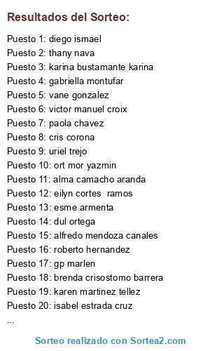 Lista de participantes: abi chavez soberanes , ahuizotl andrade aguilar , ailyn cortez ramos , ale gi , alejandro tellez giron cano , alfredo mendoza canales , alma camacho aranda , andrea vazquez , anna azuara , berenice leon , brenda crisostomo barrera , brian alcanu , bryan arteaga , claudia fuentes , cris corona , daniela cortes de barrera , dann nava , diana casillas , diego ismael , dul ortega , edu olivo , eduardo baca , eilyn cortes ramos , elena love lopez , elizabeth gonzalez , emir canales , esme armenta , fany vera , flor aniceto , gabriella montufar , georgette chale , gp marlen , gutierrez bacilo diego , hdz vite jorge , isabel estrada cruz , iselda bastida flores , itzel salvador , jacqueline cortes aguilar , javier escalante , jean paul sant , jorge luis gonzalez pacheco , josue suarez hernandez , juan escamilla , juan flores villa , karen martinez tellez , karina bustamante karina , lalo bategi , lbk vintagge , leydy hernandez hernandez , lizeth larios , madymojoe tavera , marai aguirre , maricar sanchez , mariluu anve , maritza jimenez jimenez , marysol montiel reymundo , mitsuha castañeda , monica hernandez , natha hernandez carrillo , ort mor yazmin , oscar moedano , packo chavez , paola chavez , roberto hernandez , selene monzalvo mora , tania mercado , tavio gonzalez garcia , thany nava , uly l ramos , uriel trejo , ursula martinez duran , valeria santillan , vane gonzalez , victor manuel croix , yaret arm , zelth rodriguez.