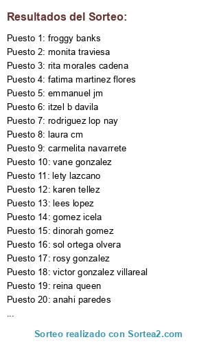 Lista de participantes: monita traviesa , rodriguez lop nay , carmelita navarrete , alberto luna sanchez , lety lazcano , dinorah gomez , rita morales cadena , karen tellez , beto sanchez , emmanuel jm , vanesa mendes alberto mendes avila , sol ortega olvera , reina queen , froggy banks , austria martinez , ventura claus , lees lopez , fatima martinez flores , leslie yadira politron , escamilla hernandez jhoana , gomez icela , vane gonzalez , itzel b davila , laura cm , anahi paredes , victor gonzalez villareal , rosy gonzalez.