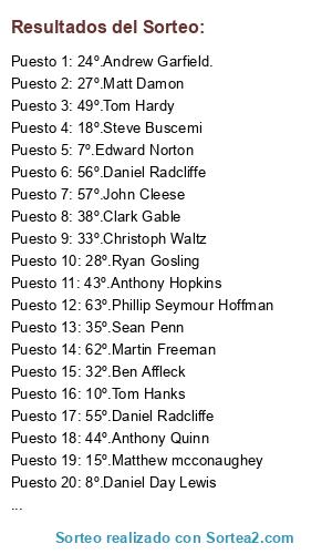 Lista de participantes: 1º.John Wayne, 2º.Harvey Keitel, 3º.Leonardo Di Caprio, 4º.Marlon Brando, 5º.Jack Nicholson, 6º.Christian Bale, 7º.Edward Norton, 8º.Daniel Day Lewis, 9º.Brad Pitt, 10º.Tom Hanks, 11º.Clint Eastwood, 12º.Morgan Freeman, 13º.Kevin Spacey, 14º.Heath Ledger, 15º.Matthew mcconaughey, 16º.Robert De Niro, 17º.Al Pacino, 18º.Steve Buscemi, 19º.Robin Williams, 20º.Denzel Washington, 21º.Rusell Crowe, 22º.Eddie Murphy, 23º.Robert Downey Jr., 24º.Andrew Garfield., 25º.Charlie Chaplin, 26º.Jared Leto, 27º.Matt Damon, 28º.Ryan Gosling, 29º.Mark Wahlberg, 30º.Jason Statham, 31º.Vincent d´onofrio, 32º.Ben Affleck, 33º.Christoph Waltz, 34º.Peter O'Toole, 35º.Sean Penn, 36º.Mads Mikkelsen, 37º.James Gandolfini., 38º.Clark Gable, 39º.Charlton Heston, 40º.Jack Lemmon, 41º.Jake Gyllenhaal., 42º.Charlie Hunnam, 43º.Anthony Hopkins, 44º.Anthony Quinn, 45º.Steve McQueen., 46º.Wesley Snipes, 47º.Marcello Mastroianni, 48º.Charles Laughton, 49º.Tom Hardy, 50º.Joseph Gordon-Levitt, 51º.Bryan Cranston, 52º.Benedict Cumberbatch., 53º.Arnold Schwarzenneger, 54º.Johnny Depp, 55º.Daniel Radcliffe, 56º.Daniel Radcliffe, 57º.John Cleese, 58º.Christopher Lee, 59º.Ian Mckellen, 60º.Samuel L. Jackson, 61º.vigo mortensen., 62º.Martin Freeman, 63º.Phillip Seymour Hoffman, 64º.Bruno Ganz.
