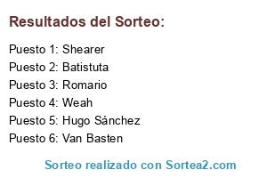 Lista de participantes: Hugo Sánchez, Shearer, Batistuta, Romario, Van Basten, Weah.