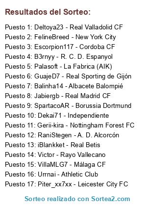 Lista de participantes: Jabiergb - Real Madrid CF, VillaMLG7 - Málaga CF, Palasoft - La Fabrica (AIK), Victor - Rayo Vallecano, RaniStegen - A. D. Alcorcón, Escorpion117 - Cordoba CF, Deltoya23 - Real Valladolid CF, Piter_xx7xx - Leicester City FC, FelineBreed - New York City, Balinha14 - Albacete Balompié, iBlankket - Real Betis, Dekai71 - Independiente, SpartacoAR - Borussia Dortmund, Gerii-kira - Nottingham Forest FC, Urrnai - Athletic Club, GuajeD7 - Real Sporting de Gijón, B3rnyy - R. C. D. Espanyol.