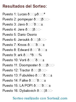 Lista de participantes: Dybalovich 🇦🇷, Vorti 🇨🇱, LA POPI 🇨🇱, Fubukileo 🇨🇱, Jere 🇦🇷, Edward 🇨🇱, Lucas 🇵🇪, Doomposter 🇦🇷, Jeroukk 🇦🇷, Tractor 🇦🇷, Falke 🇨🇱, pompeyar 🇦🇷, ark 🇺🇾, Kroos 🇨🇱, Javo 🇨🇱, Dario Osorio.
