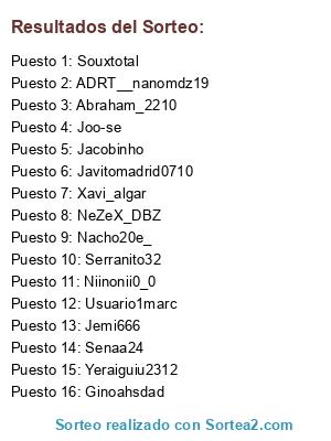 Lista de participantes: Usuario1marc, Jemi666, Javitomadrid0710, Jacobinho, Senaa24, Souxtotal, Abraham_2210, ADRT__nanomdz19, Joo-se, Yeraiguiu2312, Nacho20e_, Niinonii0_0, NeZeX_DBZ, Serranito32, Xavi_algar, Ginoahsdad.