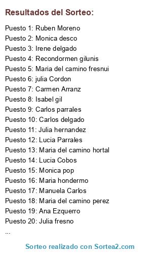 Lista de participantes: Monica desco, Irene delgado, Recondormen gilunis, Maria del camino fresnui, julia Cordon, Carmen Arranz, Isabel gil, Carlos parrales, Carlos delgado, Julia hernandez, Lucia Parrales, Maria del camino hortal, Lucia Cobos, Monica pop, Maria hondermo, Manuela Carlos, Maria del camino perez, Ana Ezquerro, Julia fresno, Carmena Holuis, Carlos Gomez, Carmen gil, Lis Mendizábal, Julia gil, Mario fernandez, Pablo sisgienzaa, Monica defrinc, Isabel hondante, Rafael jimenez, Irene gil, Irene fernandez, Rafael jilim, Ruben Moreno.