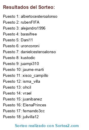 Lista de participantes: bassifree, kustodic, ElenaPrinces, fernando3cc, xisco_campillo, albertocesteroalonso, danielcesteroalonso, vrael, juampi310, isma_villa, juanibanez, alejandro1996, julivilla12, jaume-marti, ohcil, uroncoroni, rubenFIFA, Dani11.