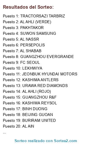 Lista de participantes: AL NASSR, AL SHABAB, AL HILAL, AL AHLI (VERDE), LEKHWIYA, AL SADD, PERSEPOLIS, FOOLAD KHOUZESTAN, TRACTORSAZI TARBRIZ, NAFT THERAN, PAKHTAKOR, LOKOMOTIV, NASAF, BUNYODKOR, AL AIN, AL AHLI (ROJO), BRISBANE ROAR, W. SYDNEY WANDERERS, BEIJING GUOAN, SHANDONG LUNENG, GUANGZHOU EVERGRANDE, GUANGZHOU R&F, GAMBA OZAKA, URAWA RED DIAMONDS, KASHIMA ANTLERS, KASHIWA REYSOL, JEONBUK HYUNDAI MOTORS, SEONGNAM FC, SUWON SAMSUNG, FC SEOUL, BURIRAM UNITED, BINH DUONG.