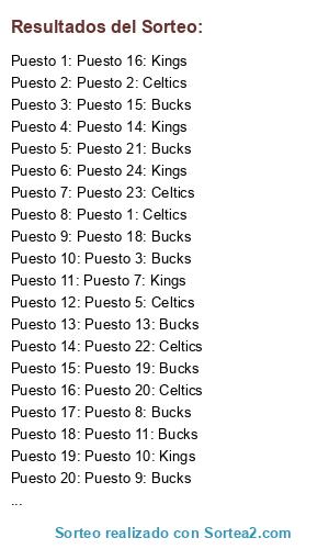 Lista de participantes: Puesto 1: Celtics, Puesto 2: Celtics, Puesto 3: Bucks, Puesto 4: Celtics, Puesto 5: Celtics, Puesto 6: Celtics, Puesto 7: Kings, Puesto 8: Bucks, Puesto 9: Bucks, Puesto 10: Kings, Puesto 11: Bucks, Puesto 12: Kings, Puesto 13: Bucks, Puesto 14: Kings, Puesto 15: Bucks, Puesto 16: Kings, Puesto 17: Kings, Puesto 18: Bucks, Puesto 19: Bucks, Puesto 20: Celtics, Puesto 21: Bucks, Puesto 22: Celtics, Puesto 23: Celtics, Puesto 24: Kings.
