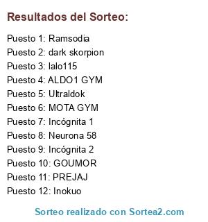 Lista de participantes: Ramsodia, ALDO1 GYM, dark skorpion, GOUMOR, Incógnita 1 , Incógnita 2, Inokuo, lalo115, MOTA GYM , Neurona 58, PREJAJ, Ultraldok.