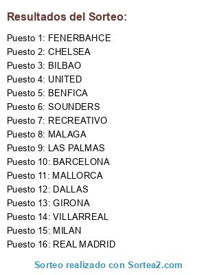 Lista de participantes: MILAN, DALLAS, MALAGA, GIRONA, FENERBAHCE, RECREATIVO, BILBAO, LAS PALMAS, MALLORCA, VILLARREAL, CHELSEA, SOUNDERS, REAL MADRID, UNITED, BENFICA, BARCELONA.