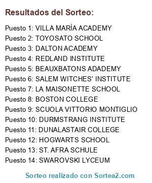 Lista de participantes: DUNALASTAIR COLLEGE, BEAUXBATONS ADADEMY, DALTON ACADEMY, VILLA MARÍA ACADEMY, DURMSTRANG INSTITUTE, LA MAISONETTE SCHOOL, SALEM WITCHES' INSTITUTE, HOGWARTS SCHOOL, REDLAND INSTITUTE, BOSTON COLLEGE, SWAROVSKI LYCEUM, SCUOLA VITTORIO MONTIGLIO, ST. AFRA SCHULE, TOYOSATO SCHOOL.