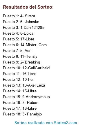 Lista de participantes: 1-Dani121295, 2- Breaking, 3- Panelojo, 4- Sirera, 5- Adri, 6- Johnske, 7- Ruben, 8-Epica, 9-Andronymous, 10-Fer, 11-Hensly, 12-GaliGaribaldi, 13-Axel Lexa, 14-Mister_Corn, 15-Libre, 16-Libre, 17-Libre, 18-Libre.