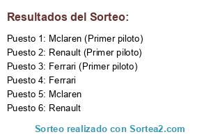 Lista de participantes: Ferrari (Primer piloto), Mclaren (Primer piloto), Renault (Primer piloto), Ferrari, Mclaren, Renault.