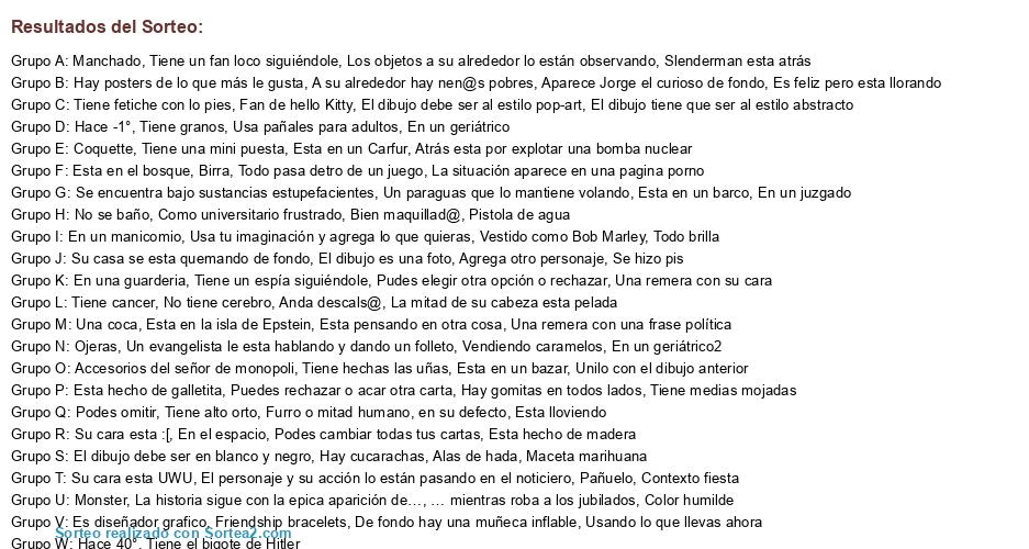 Lista de participantes: … mientras roba a los jubilados, A su alrededor hay nen@s pobres, Accesorios del señor de monopoli, Agrega otro personaje, Alas de hada, Anda descals@, Aparece Jorge el curioso de fondo, Atrás esta por explotar una bomba nuclear, Bien maquillad@, Birra, Color humilde, Como universitario frustrado, Contexto fiesta, Coquette, De fondo hay una muñeca inflable, El dibujo debe ser al estilo pop-art, El dibujo debe ser en blanco y negro, El dibujo es una foto, El dibujo tiene que ser al estilo abstracto, El personaje y su acción lo están pasando en el noticiero, En el espacio, En un geriátrico, En un geriátrico2, En un juzgado, En un manicomio, En una guarderia, Es diseñador grafico, Es feliz pero esta llorando, Esta en el bosque, Esta en la isla de Epstein, Esta en un barco, Esta en un bazar, Esta en un Carfur, Esta hecho de madera, Esta hecho de galletita, Esta lloviendo, Esta pensando en otra cosa, Fan de hello Kitty, Friendship bracelets, Hace -1°, Hace 40°, Hay cucarachas, Hay gomitas en todos lados, Hay posters de lo que más le gusta, La historia sigue con la epica aparición de…, La mitad de su cabeza esta pelada, La situación aparece en una pagina porno, Los objetos a su alrededor lo están observando, Maceta marihuana, Manchado, Monster, No se baño, No tiene cerebro, Ojeras, Pañuelo, Pistola de agua, Podes cambiar todas tus cartas, Podes omitir, Pudes elegir otra opción o rechazar, Puedes rechazar o acar otra carta, Se encuentra bajo sustancias estupefacientes, Se hizo pis, Slenderman esta atrás, Su cara esta :[, Su cara esta UWU, Su casa se esta quemando de fondo, Tiene alto orto, Tiene cancer, Tiene el bigote de Hitler, Tiene fetiche con lo pies, Tiene granos, Tiene hechas las uñas, Tiene medias mojadas, Tiene un espía siguiéndole, Tiene un fan loco siguiéndole, Tiene una mini puesta, Todo brilla, Todo pasa detro de un juego, Un evangelista le esta hablando y dando un folleto, Un paraguas que lo mantiene volando, Una coca, Una remera con su cara, Una remera con una frase política, Unilo con el dibujo anterior, Usa pañales para adultos, Usa tu imaginación y agrega lo que quieras, Usando lo que llevas ahora, Vendiendo caramelos, Vestido como Bob Marley, Furro o mitad humano, en su defecto.
