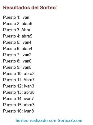 Lista de participantes: Abra, ivan, abra2, ivan2, abra3, Ivan3, abra4, ivan4, abra5, ivan5, abra6, ivan6, Abra7, ivan7, abra8, ivan8.