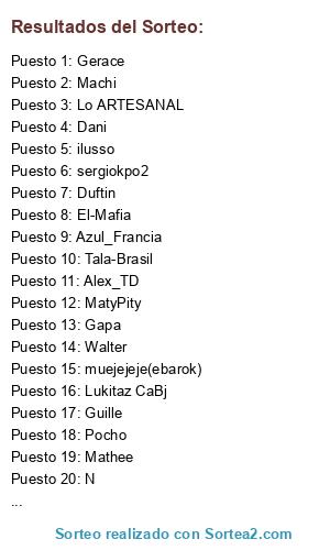 Lista de participantes: Jaamen, GallitoCDM, [M]end0C!n[O], Gerace, Dani, EmiB12, Topo_Yiyo, Mathee, Guido, AleLXColon, Jigsaw, Gapa, Mellu, Juanma+10, Rodriakd, MatyPity, AgusCuervo, S, Boster, NikoCarp, Jero, Windem, Exe, Guille, NikoArg, Alex_TD, July, Pocho, Chumi, sergiokpo2, Menduko, N, Corto, Walter, Kurei, Tony+10, Briancitu, Maschi, Tiki-Tiki, El-Mafia, Defensayjus, Machi, Lucas.B, Joga, Koko, Guidoleproso, (Alexsitho), Bob_Tricolor, El_Animal, ilusso, Beto_tony, Sebalima, Ariel.G, Jubilado, Matiaz, Franco_Racing, Eliamm, Locox, Azul_Francia, Eber, Molito, Lo ARTESANAL, Ezequiel93, !!_JorGE1_!!, JR_RIQUELME (no_lag), MatyRC, Duftin, Tanitu, Tala-Brasil, EXE_TATENGUE, Ruperto, ~Fede·AKD, Lukitaz CaBj, Zinho, MarceloCAI, muejejeje(ebarok).