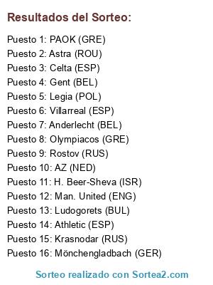 Lista de participantes: Man. United (ENG), Olympiacos (GRE), Anderlecht (BEL), AZ (NED), Astra (ROU), Athletic (ESP), Celta (ESP), Gent (BEL), Krasnodar (RUS), PAOK (GRE), H. Beer-Sheva (ISR), Villarreal (ESP), Rostov (RUS), Mönchengladbach (GER), Legia (POL), Ludogorets (BUL).
