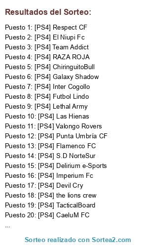 Lista de participantes: [PS4] Las Hienas , [PS4] ChiringuitoBull, [PS4] CaeluM FC, [PS4] Dark Falcons CF, [PS4] Valongo Rovers, [PS4] Futbol Lindo, [PS4] Team Addict, [PS4] Inter Cogollo, [PS4] Licor Kafé, [PS4] El Niupi Fc, [PS4] eSports Las Palmas , [PS4] Galaxy Shadow, [PS4] TacticalBoard, [PS4] the lions crew, [PS4] Respect CF, [PS4] Lethal Army, [PS4] Imperium Fc, [PS4] Punta Umbría CF, [PS4] Delirium e-Sports, [PS4] Inter Legends, [PS4] Flamenco FC, [PS4] S.D NorteSur, [PS4] Devil Cry, [PS4] RAZA ROJA.