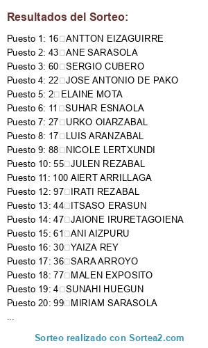 Lista de participantes: 1 IZAR LERTXUNDI, 2 ELAINE MOTA, 3 MAIALEN HUEGUN, 4 SUNAHI HUEGUN, 5 NEREA ARRUTI, 6 AIMAR REZABAL, 7 YERAI ARANGUREN, 8 OIER MOSQUERA, 9 UNAI JUARISTI, 10 GARAZI SALEGI, 11 SUHAR ESNAOLA, 12 JUNE ARRUTI, 13 SUA AUZMENDI, 14 IRAIA SOLABARRIETA, 15 BEÑAT SANCHEZ, 16 ANTTON EIZAGUIRRE, 17 LUIS ARANZABAL, 18 XUBANE ITXASO, 19 ILIAN ITXASO, 20 EKAIZ DE PAKO, 21 ALAITZ DE PAKO, 22 JOSE ANTONIO DE PAKO, 23 INGE ROTETA, 24 JULE ROTETA, 25 AITZ ETXARRI, 26 EDUARDO GALLEGO, 27 URKO OIARZABAL, 28 AXEL UNANUE, 29 BITTOR ZULOAGA, 30 YAIZA REY, 31 AIUR BEORLEGI, 32 EKI AIZPURUA, 33 BITTOR EIZAGUIRRE, 34 LOHITZ EIZAGUIRRE, 35 INTZA ITURAIN, 36 SARA ARROYO, 37 LEIRE ARROYO, 38 ARENE IRIBAR, 39 ANE ITURAIN, 40 URKO DEL BARRIO, 41 AMETS ITURAIN, 42 JOSE ETXABE, 43 ANE SARASOLA, 44 ITSASO ERASUN, 45 MIREN IRURETOGOIENA, 46 LEIRE IRURETAGOIENA, 47 JAIONE IRURETAGOIENA, 48 ANDONI AMUNARRIZ, 49 AITOR ODRIOZOLA, 50 JOSU IRURETAGOIENA, 51 ALAIA RIBIER, 52 OIHAN RIBIER, 53 GERENC RIBIER, 54 PAULA ARANGUREN, 55 JULEN REZABAL, 56 AGURTZANE GARMENDIA, 57 MIREIA URBIETA, 58 NEREA CUBERO, 59 MAIALEN CUBERO, 60 SERGIO CUBERO, 61 ANI AIZPURU, 62 OINATZ ILLARAMENDI, 63 URTZI ZABALA, 64 PERU AZPIROZ, 65 XUBAN ILLARAMENDI, 66 XABIER LARRAÑAGA, 67 JON LARRAÑAGA, 68 ANDONI LARRAÑAGA, 69 NEREA URBIETA, 70 KOLDO MANTEROLA, 71 AIMAR IRURETAGOIENA, 72 GAIZA IRURETAGOIENA, 73 OIER IZETA, 74 EÑAUT IZETA, 75 MARKEL EXPOSITO, 76 NADETH EXPOSITO, 77 MALEN EXPOSITO, 78 ANDER EXPOSITO, 79 LEIA ARREGI, 80 GARAZI EIZMENDI, 81 DONA LERTXUNDI, 82 ALEX HOYOS, 83 JOKIN ALUSTIZA, 84 JULEN ZULOAGA, 85 MIKEL ZULOAGA, 86 AXIER ODRIOZOLA, 87 ANGEL LERTXUNDI, 88 NICOLE LERTXUNDI, 89 NOA LERTXUNDI, 90 AURITZ UDABE, 91 ASIER ARRUTI, 92 IZASKUN ITURRIOZ, 93 LAURENTXI ITURAIN, 94 HARITZ LIZASO, 95 NORA IRURETAGOIENA, 96 AITZOL IRURETAGOIENA, 97 IRATI REZABAL, 98 UXUE ITURAIN, 99 MIRIAM SARASOLA, 100 AIERT ARRILLAGA, 101 MARKEL ARRILLAGA, 102 IMANOL ARRUTI, 103 ALAITZ ZULAIKA, 104 OIER ARANZABAL.