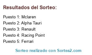 Lista de participantes: Ferrari, Mclaren, Racing Point, Alpha Tauri, Renault.