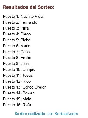 Lista de participantes: Cebo, Emilio, Fernando, Jesus, Juan, Gordo Orejon, Mala, Mario, Nachito Vidal, Pirra, Picho, Rico, Chapis, Power, Rafa, Diego.