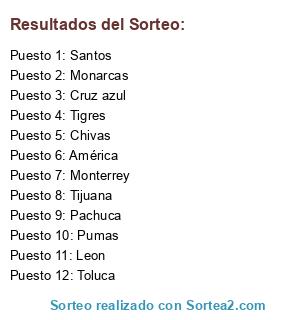 Lista de participantes: Cruz azul, América , Chivas, Monterrey, Pumas, Tigres, Monarcas, Leon, Pachuca , Santos , Toluca , Tijuana, .
