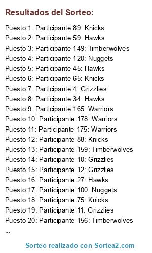 Lista de participantes: Participante 1: Grizzlies, Participante 2: Grizzlies, Participante 3: Grizzlies, Participante 4: Grizzlies, Participante 5: Grizzlies, Participante 6: Grizzlies, Participante 7: Grizzlies, Participante 8: Grizzlies, Participante 9: Grizzlies, Participante 10: Grizzlies, Participante 11: Grizzlies, Participante 12: Grizzlies, Participante 13: Grizzlies, Participante 14: Grizzlies, Participante 15: Grizzlies, Participante 16: Grizzlies, Participante 17: Grizzlies, Participante 18: Grizzlies, Participante 19: Grizzlies, Participante 20: Grizzlies, Participante 21: Grizzlies, Participante 22: Grizzlies, Participante 23: Grizzlies, Participante 24: Grizzlies, Participante 25: Hawks, Participante 26: Hawks, Participante 27: Hawks, Participante 28: Hawks, Participante 29: Hawks, Participante 30: Hawks, Participante 31: Hawks, Participante 32: Hawks, Participante 33: Hawks, Participante 34: Hawks, Participante 35: Hawks, Participante 36: Hawks, Participante 37: Hawks, Participante 38: Hawks, Participante 39: Hawks, Participante 40: Hawks, Participante 41: Hawks, Participante 42: Hawks, Participante 43: Hawks, Participante 44: Hawks, Participante 45: Hawks, Participante 46: Hawks, Participante 47: Hawks, Participante 48: Hawks, Participante 49: Hawks, Participante 50: Hawks, Participante 51: Hawks, Participante 52: Hawks, Participante 53: Hawks, Participante 54: Hawks, Participante 55: Hawks, Participante 56: Hawks, Participante 57: Hawks, Participante 58: Hawks, Participante 59: Hawks, Participante 60: Knicks, Participante 61: Knicks, Participante 62: Knicks, Participante 63: Knicks, Participante 64: Knicks, Participante 65: Knicks, Participante 66: Knicks, Participante 67: Knicks, Participante 68: Knicks, Participante 69: Knicks, Participante 70: Knicks, Participante 71: Knicks, Participante 72: Knicks, Participante 73: Knicks, Participante 74: Knicks, Participante 75: Knicks, Participante 76: Knicks, Participante 77: Knicks, Participante 78: Knicks, Participante 79: Knicks, Participante 80: Knicks, Participante 81: Knicks, Participante 82: Knicks, Participante 83: Knicks, Participante 84: Knicks, Participante 85: Knicks, Participante 86: Knicks, Participante 87: Knicks, Participante 88: Knicks, Participante 89: Knicks, Participante 90: Knicks, Participante 91: Knicks, Participante 92: Knicks, Participante 93: Nuggets, Participante 94: Nuggets, Participante 95: Nuggets, Participante 96: Nuggets, Participante 97: Nuggets, Participante 98: Nuggets, Participante 99: Nuggets, Participante 100: Nuggets, Participante 101: Nuggets, Participante 102: Nuggets, Participante 103: Nuggets, Participante 104: Nuggets, Participante 105: Nuggets, Participante 106: Nuggets, Participante 107: Nuggets, Participante 108: Nuggets, Participante 109: Nuggets, Participante 110: Nuggets, Participante 111: Nuggets, Participante 112: Nuggets, Participante 113: Nuggets, Participante 114: Nuggets, Participante 115: Nuggets, Participante 116: Nuggets, Participante 117: Nuggets, Participante 118: Nuggets, Participante 119: Nuggets, Participante 120: Nuggets, Participante 121: Nuggets, Participante 122: Nuggets, Participante 123: Timberwolves, Participante 124: Timberwolves, Participante 125: Timberwolves, Participante 126: Timberwolves, Participante 127: Timberwolves, Participante 128: Timberwolves, Participante 129: Timberwolves, Participante 130: Timberwolves, Participante 131: Timberwolves, Participante 132: Timberwolves, Participante 133: Timberwolves, Participante 134: Timberwolves, Participante 135: Timberwolves, Participante 136: Timberwolves, Participante 137: Timberwolves, Participante 138: Timberwolves, Participante 139: Timberwolves, Participante 140: Timberwolves, Participante 141: Timberwolves, Participante 142: Timberwolves, Participante 143: Timberwolves, Participante 144: Timberwolves, Participante 145: Timberwolves, Participante 146: Timberwolves, Participante 147: Timberwolves, Participante 148: Timberwolves, Participante 149: Timberwolves, Participante 150: Timberwolves, Participante 151: Timberwolves, Participante 152: Timberwolves, Participante 153: Timberwolves, Participante 154: Timberwolves, Participante 155: Timberwolves, Participante 156: Timberwolves, Participante 157: Timberwolves, Participante 158: Timberwolves, Participante 159: Timberwolves, Participante 160: Timberwolves, Participante 161: Warriors, Participante 162: Warriors, Participante 163: Warriors, Participante 164: Warriors, Participante 165: Warriors, Participante 166: Warriors, Participante 167: Warriors, Participante 168: Warriors, Participante 169: Warriors, Participante 170: Warriors, Participante 171: Warriors, Participante 172: Warriors, Participante 173: Warriors, Participante 174: Warriors, Participante 175: Warriors, Participante 176: Warriors, Participante 177: Warriors, Participante 178: Warriors, Participante 179: Warriors, Participante 180: Warriors, Participante 181: Warriors, Participante 182: Warriors, Participante 183: Warriors, Participante 184: Warriors, Participante 185: Warriors, Participante 186: Warriors, Participante 187: Warriors, Participante 188: Warriors.
