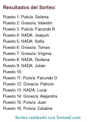 Lista de participantes: Puto/a: Catalina, Groso/a: Tomas, NADA: Julian, NADA: Joaquin, NADA: Sofia, NADA: Lucia, NADA: Giuliana, Puto/a: Facundo O, Puto/a: Facundo R, Puto/a: Selenia, Puto/a: Juan, Groso/a: Alejandra, Groso/a: Patricio, Groso/a: Valentin, Groso/a: Virginia, .