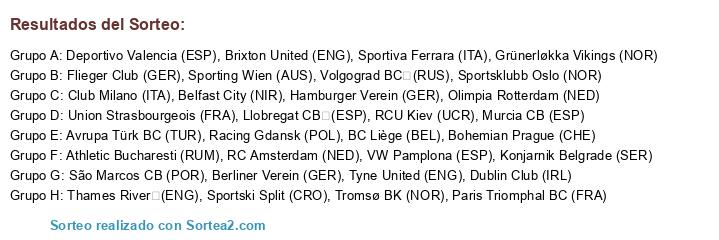 Lista de participantes: Konjarnik Belgrade (SER), Bohemian Prague (CHE), Sportski Split (CRO), Racing Gdansk (POL), Avrupa Türk BC (TUR), Athletic Bucharesti (RUM), Volgograd BC (RUS), RCU Kiev (UCR), Tromsø BK (NOR), Sportsklubb Oslo (NOR), Grünerløkka Vikings (NOR), Dublin Club (IRL), Sporting Wien (AUS), Olimpia Rotterdam (NED), BC Liège (BEL), RC Amsterdam (NED), Paris Triomphal BC (FRA), Union Strasbourgeois (FRA), Llobregat CB (ESP), VW Pamplona (ESP), Murcia CB (ESP), Deportivo Valencia (ESP), Berliner Verein (GER), Flieger Club (GER), Hamburger Verein (GER), Sportiva Ferrara (ITA), Club Milano (ITA), Thames River (ENG), Brixton United (ENG), Tyne United (ENG), Belfast City (NIR), São Marcos CB (POR).