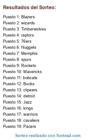 Lista de participantes: Blazers, wizards, bobcats, cavaliers, Memphis, Pacers, Rockets, Mavericks, Bucks, warriors, Jazz, detroit, 76ers, Nuggets, Timberwolves, kings, raptors, spurs, clipeers.
