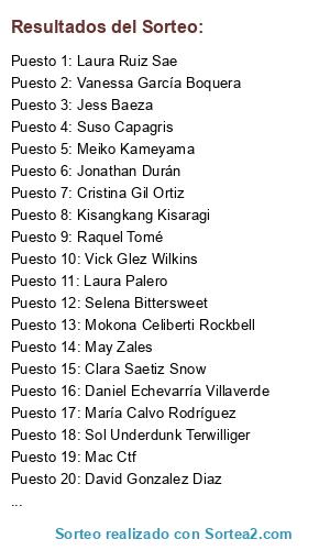 Lista de participantes: Bárbara Jurado Sánchez(3 participaciones), Raquel Tomé(3 participaciones), Esther Galan Recuero, Laura Ruiz Sae(3 participaciones), Laura Palero(3 participaciones), María Calvo Rodríguez(2 participaciones), Cristina Gil Ortiz(3 participaciones), Fiorella Bendezú(2 participaciones), Daniel Echevarría Villaverde(3 participaciones), Vanessa García Boquera(2 participaciones), Suso Capagris(3 participaciones), Kamapon Ilustración(2 participaciones), Jess Baeza(2 participaciones), Meiko Kameyama(3 participaciones), Kisangkang Kisaragi(3 participaciones), Mokona Celiberti Rockbell(3 participaciones), Sol Underdunk Terwilliger(2 participaciones), Andrea S. Rivero, Miguel Di Ferrera García(2 participaciones), May Zales(3 participaciones), Nagy May(3 participaciones), Mac Ctf(3 participaciones), Selena Bittersweet(3 participaciones), Clara Saetiz Snow(3 participaciones), Vick Glez Wilkins(3 participaciones), David Gonzalez Diaz, Maria Teresa B P(2 participaciones), Paloma Espinosa, Jonathan Durán(2 participaciones).