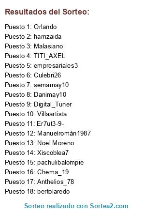 Lista de participantes: empresariales3, Culebri26, bertolaredo, Xiscoblea7, semamay10, pachulibalompie, Digital_Tuner, Chema_19, Danimay10, Villaartista, Er7ut3-9-, Manuelromán1987, hamzaida, TITI_AXEL, Malasiano, Anthelios_78, Noel Moreno, Orlando.