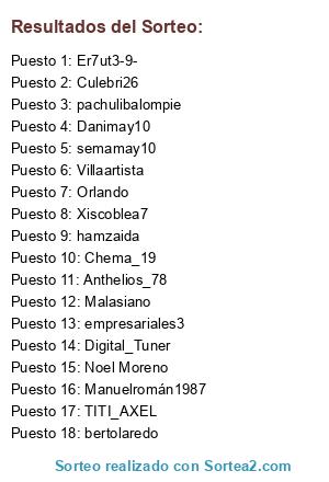 Lista de participantes: empresariales3, Culebri26, bertolaredo, Xiscoblea7, semamay10, pachulibalompie, Digital_Tuner, Chema_19, Danimay10, Villaartista, Er7ut3-9-, Manuelromán1987, hamzaida, TITI_AXEL, Malasiano, Anthelios_78, Noel Moreno, Orlando.