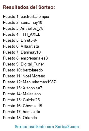 Lista de participantes: empresariales3, Culebri26, bertolaredo, Xiscoblea7, semamay10, pachulibalompie, Digital_Tuner, Chema_19, Danimay10, Villaartista, Er7ut3-9-, Manuelromán1987, hamzaida, TITI_AXEL, Malasiano, Anthelios_78, Noel Moreno, Orlando.