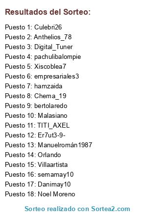 Lista de participantes: empresariales3, Culebri26, bertolaredo, Xiscoblea7, semamay10, pachulibalompie, Digital_Tuner, Chema_19, Danimay10, Villaartista, Er7ut3-9-, Manuelromán1987, hamzaida, TITI_AXEL, Malasiano, Anthelios_78, Noel Moreno, Orlando.