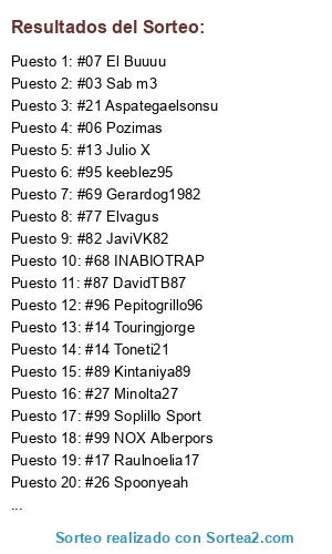 Lista de participantes: #07 El Buuuu - #03 Sab m3, #21 Aspategaelsonsu - #06 Pozimas, #13 Julio X - #95 keeblez95, #69 Gerardog1982 - #77 Elvagus, #82 JaviVK82 - #68 INABIOTRAP, #87 DavidTB87 - #96 Pepitogrillo96, #14 Touringjorge - #14 Toneti21, #89 Kintaniya89 - #27 Minolta27, #99 Soplillo Sport - #99 NOX Alberpors, #17 Raulnoelia17 - #26 Spoonyeah, #42 RoberAstur - #88 Caraja1.
